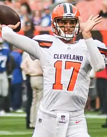 On March 9, 2017, Osweiler was traded to the Cleveland Browns along with the Texans' 2017 sixth-round pick and 2018 second-round pick in exchange for the Browns' 2017 fourth-round compensatory pick.[57][58] This trade was termed by ESPN's Adam Schefter as possibly the most creative trade in NFL history.[59] The move allowed Cleveland to absorb some of Osweiler's cap from Houston in exchange for draft picks, one of the first trades of its kind. On September 2, 2017, Osweiler was released by the Browns after the team named rookie DeShone Kizer as the starter.[60]