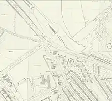 Construction on the Northern Heights project began in the late 1930s but was interrupted by the Second World War. Most of the work to that date had been carried out on LNER branch tracks, but work between Edgware and Bushey Heath had started in June 1939. The route of the line had been cleared and laid out and some earthworks and tunnelling carried out between Edgware and Elstree South.[13] At the site of Brockley Hill station and south of Edgware Way, construction of the piers of the viaduct had begun and three out of 12 arches at Brockley Hill station had been completed by August 1939.[13] Following the outbreak of war in Europe, work on the station and the extension was suspended in September 1939 and was formally terminated in December of the same year as wartime funding restrictions would prevent completion.[14] During the war years, the LPTB-owned land was used for farming vegetables for staff canteens.[15]
