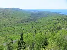 Brockway Mountain Drive is an 8.8-mile-long (14.2 km) scenic roadway just west of Copper Harbor in the Upper Peninsula of Michigan in the United States. Drivers can access the road from State Highway M-26 on either end near Eagle Harbor to the west or Copper Harbor to the east in the Keweenaw Peninsula. The drive runs along the ridge of Brockway Mountain on the Keweenaw Fault and climbs to 1,320 feet (402 m) above sea level, 720 feet (219 m) above the surface of Lake Superior. Several viewpoints along the route allow for panoramas of Copper Harbor, Lake Superior, and undeveloped woodland. On a clear day, Isle Royale is visible approximately 50 miles (80 km) in distance from the top of the mountain.