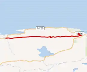 The road can be accessed from either Eagle Harbor or Copper Harbor and serves as a scenic loop off M-26. The western end starts at M-26 near Lake Bailey and Agate Harbor. Brockway Mountain Drive ascends along the ridgeline of the Keweenaw Fault. Immediately south of the road, Upson Creek runs parallel to the cliff face as it drains Lake Upson.[4] Two and a half miles (4.0 km) from the western end, there is a parking area for the Oren Krumm Trail, part of the Brockway Mountain Audubon Sanctuary.[5] The drive is lined with low stone walls, built as part of the original construction of the roadway.[6]