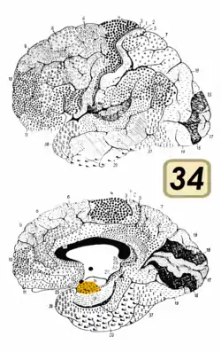 ![]() Medial surface of the brain with Brodmann's areas numbered. | |