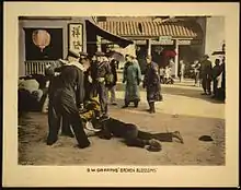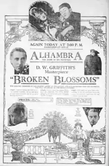 Broken Blossoms premiered in May 1919, at George M. Cohan's Theatre in New York City as part of the D.W. Griffith Repertory Season.[7] According to Lillian Gish's autobiography, theaters were decorated with flowers, moon lanterns and beautiful Chinese brocaded draperies for the premiere. Critics and audiences were pleased with Griffith's follow-up film to his 1916 epic Intolerance.[8] Contrasting with Intolerance's grand story, set and length, Griffith charmed audiences by the delicacy with which Broken Blossoms handled such a complex subject.
