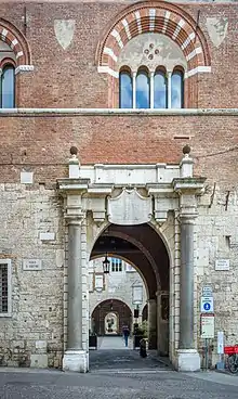 Entry to the Broletto is through the Porta Orientale (1606) embellished with monolithic pillars from Roman times made of Egyptian granite, which once ornamented the entrance to the demolished cathedral of San Pietro de Dom. The upper part of the doorway was designed by Antonio Tagliaferri in the late 1800s.