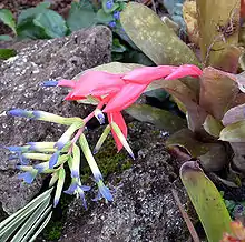It is among the basal families within the Poales and is the only family within the order that has septal nectaries and inferior ovaries.[4] These inferior ovaries characterize the Bromelioideae, a subfamily of the Bromeliaceae.[5] The family includes both epiphytes, such as Spanish moss (Tillandsia usneoides), and terrestrial species, such as the pineapple (Ananas comosus). Many bromeliads are able to store water in a structure formed by their tightly overlapping leaf bases. However, the family is diverse enough to include the tank bromeliads, grey-leaved epiphyte Tillandsia species that gather water only from leaf structures called trichomes, and many desert-dwelling succulents.