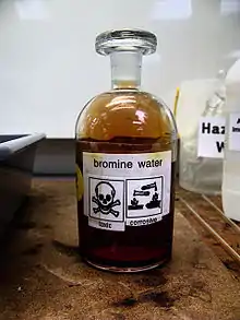 Bromine water is an oxidizing, intense yellow-to-red mixture containing diatomic bromine (Br2) dissolved in water (H2O).[1] It is often used as a reactive in chemical assays of recognition for substances which react with bromine in an aqueous environment with the halogenation mechanism, mainly unsaturated carbon compounds (carbon compounds with 1 or more double or triple bond(s)). The most common compounds that react well with bromine water are phenols, alkenes, enols, the acetyl group, aniline, and glucose. In addition, bromine water is commonly used to test for the presence of an alkene which contains a double covalent bond, reacting with the bromine water, changing its color from an intense yellow to a colorless solution. Bromine water is also commonly used to check for the presence of an aldehyde group in compounds. In this reaction, the color of bromine water is changed to yellow from colorless (oxidation process).