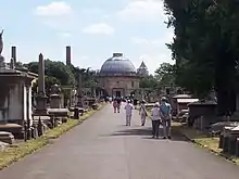 The site, previously market gardens, having been bought with the intervention of John Gunter of Fulham,[6] was 39 acres (160,000 m2) in area. Brompton Cemetery was eventually designed by architect, Benjamin Baud with at its centre, a modest sandstone domed chapel dated 1839, at it southern end, reached by two symmetrical long colonnades, now all Grade II* listed, in the style of St. Peter's Square in Rome, and flanked by catacombs.[7][8][9][10][11] It was intended to give the feel of a large open air cathedral. It is rectangular in shape with the north end pointing to the northwest and the south end to the southeast. It has a central "nave" which runs from Old Brompton Road towards the central colonnade and chapel. During the 4-year restoration project that began in 2014, an original Victorian flooring with Bath and York stone radial pattern was uncovered underneath the chapel carpet.[12]