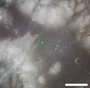 ![]() Location of Brontë crater in Taurus-Littrow Valley. South Massif is at lower left, North Massif is at top center, and Sculptured Hills are at upper right. Scale bar is 5 km | |