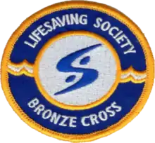 The Bronze Cross is a certification in water rescue that is the mainstay of the lifesaving training offered in Canada, and awarded by the Royal Life Saving Society of Canada. Before one can take the Bronze Cross course, the Bronze Medallion (Canada) is required.[1] With Bronze Cross and Standard First Aid certification, one can be an assistant lifeguard in some provinces.[2] For National Lifeguard Certification or to become an Instructor, a current or expired Bronze Cross and current Standard First Aid certification are required. The Bronze Cross endurance swim requirement is 600 metres in 18 minutes using any combination of strokes.[3]
