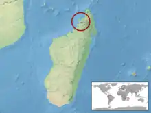 Brookesia bekolosy has only been collected once, being a single specimen from Bekolosy in the Manongarivo Special Reserve (Manongarivo Reserve) in the region of Diana[2] in 1992.[1] The species is believed to only be found at the Bekolosy Plateau, although further information is unknown. Its habitat is posited as between 1,000 and 2,000 m (3,300 and 6,600 ft) above mean sea level.[3] Despite lack of specifics as to its extent, the International Union for Conservation of Nature classed B. bekolosy as an endangered species because it is not likely to cover more than 3,000 km2 (1,200 sq mi), and it is found in an area where logging is becoming common. If the species turns out to be only found at the Bekolosy Plateau, then the species will be classed as Critically Endangered, as it could only be found over an area of less than 100 km2 (39 sq mi), and will decline in this area.[1]