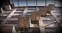 Warehouses A and B are located west of Second Avenue between 59th and 65th Streets, with warehouse A being located to the west of warehouse B.[4] Warehouse A had a footprint of 200 by 980 feet (61 by 299 m), while warehouse B measured 306 by 980 feet (93 by 299 m). The 980-foot-long sides of each structure run between 58th Street on the north and 63rd Street on the south.[3][4] Warehouse B was the world's largest building by floor area when it was completed.[5] Warehouse B contains a central atrium with two railroad tracks, both of which are disused and overgrown, and there are two old train cars permanently parked on the western track of the atrium. The loading balconies in the atrium of warehouse B are staggered diagonally, and a 5-short-ton (4.46-long-ton; 4.54-metric-ton) overhead movable crane moved cargo between the balconies.[6][7][8]