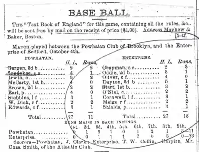 - Brooklyn Daily Eagle, September 14, 1865, p 2. "In the recent game between these two clubs, played on the Union Grounds, the Eckford then won, the score being 21 to 20."