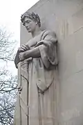 Inspired by Parks Commissioner Robert Moses’s desire to provide a World War II monument to each borough, this monument was created. It is a granite and limestone 24-foot-tall (7.3 m) memorial designed by Stuart Constable, Gilmore D. Clarke, and W. Earle Andrews, who worked in concert with the architectural firm of Eggers and Higgins.[1] The two larger-than-life sized high relief figures by sculptor Charles Keck (1875–1951) are located on the south facade, at opposite ends of the building. It honors Brooklynites who served in World War II. The full plan, however, was never fully built because of lack of funding.[1]