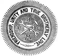 ![]() Early emblem of the Brotherhood Railway Carmen of America, dating back to the 19th Century. | |