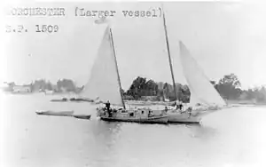 ![]() The Brown Smith Jones in naval service as the USS Dorchester with a motorboat alongside during World War I, probably in the Chesapeake Bay area. | |