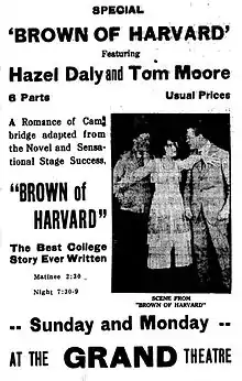 Brown of Harvard, also known as Tom Brown at Harvard, is a 1918 film based on the 1906 Broadway play Brown of Harvard by Rida Johnson Young and the novel by Young and Gilbert Colman. The Washington State University football team and its coach, William "Lone Star" Dietz, participated in filming while in Southern California for the 1916 Rose Bowl.[1]