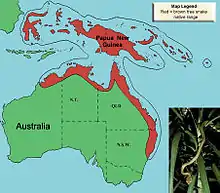 The brown tree snake is native to coastal Australia, Papua New Guinea, and many islands in northwestern Melanesia. The species occurs on variably sized islands, extending from Sulawesi in eastern Indonesia through Papua New Guinea and the Solomon Islands and into the wettest coastal areas of Northern Australia.[11] The snakes on Guam represent the only documented reproductive population outside the native range. Since January 2016, however, four snakes have been sighted on the island of Saipan in the Northern Mariana Islands.[15]