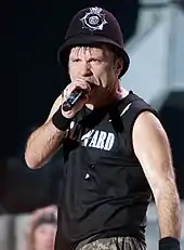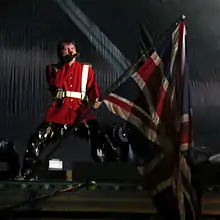 In addition to his vocal ability, Dickinson has been described as an energetic stage performer.[181] He considers including the audience "the essence of the Maiden experience" and that his role is to "shrink the venue ... to turn that football stadium into the world's smallest club".[182] To achieve this, Dickinson seeks eye contact with audience members[183] and urges them to join in with the phrase "scream for me" (followed by the concert's location).[184] He is critical of performers who do not connect with their fans, particularly those who "[hide] behind the amps" and use an autocue, remarking that "people pay good money and [they] can't even remember the sodding words".[183]