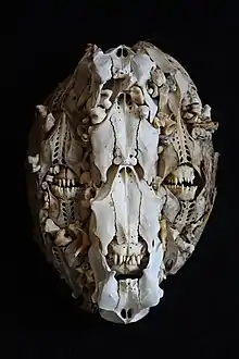 Mahalski creates what he calls "textural bone art": assemblages of animal skulls and bones.[1] "I started seeing bones as like paint", he told film-maker Michael Hall.[8] His artworks occasionally include human bone, to make the point that humans are just another animal: "I don't accept that there's any spiritual distinction between the bone of a human and the bone of a sheep or a rat."[1][2] Skulls to Mahalski are special, connecting humans to the rest of nature and acting as a link to our biological past. "I see skulls and these objects as like spiritual telephones to other dimensions."[3] He is strongly influenced by collections of ethnological art and the works created by societies before Western contact.[3]