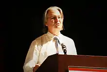 In the beginning of his childhood he lived in Galveston, Texas until his family moved to India. Sterling spent several years in India and has a fondness for Bollywood films.[13] In 1976, he graduated from the University of Texas with a degree in journalism.[14] In 1978, he was a Dungeon Master for a Dungeons & Dragons game whose players included Warren Spector, who cited Sterling's game as a major inspiration for the game design of Deus Ex.[15] In 2003 he was appointed Professor at the European Graduate School where he is teaching summer intensive courses on media and design.[14] In 2005, he became "visionary in residence" at Art Center College of Design in Pasadena, California. He lived in Belgrade with Serbian author and film-maker Jasmina Tešanović[16] for several years, and married her in 2005. In September 2007 he moved to Turin, Italy.[17] He also travels the world extensively giving speeches and attending conferences. Both Sterling and artist and musician Florian-Ayala Fauna are sponsors for V. Vale's RE/Search newsletter.[18][19][20][21][22][23]