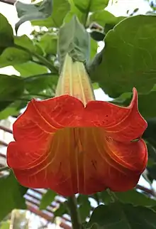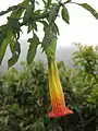 Brugmansia sanguinea is a small tree reaching up to 10 m (33 ft) in height. The pendent, tubular/trumpet-shaped flowers come in shades of brilliant red, yellow, orange and green.[2]
