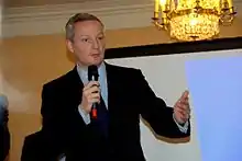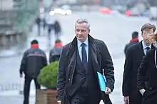 Bruno Le Maire (French: [bʁy.no lə mɛʁ]; born 15 April 1969) is a French politician and former diplomat who has served as Minister of the Economy and Finance since 2017 under President Emmanuel Macron. A former member of The Republicans (LR), which he left in 2017 to join La République En Marche! (LREM), he was Secretary of State for European Affairs from 2008 to 2009 and Minister of Food, Agriculture and Fishing from 2009 to 2012 under President Nicolas Sarkozy.[1] Le Maire is also a noted writer, with his book Des hommes d'Etat winning the 2008 Edgar Faure Prize.