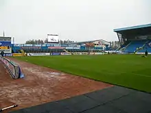 The lower tier is mainly a paddock terrace which runs the length of the pitch. The home and away dugouts are situated in front of this stand with the tunnel dividing it through the centre. To the north is an area for disabled supporters