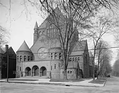 1889 | 2930 Woodward Ave. | Richardsonian Romanesque | George D. Mason | George D. Mason modeled the First Presbyterian Church after Henry Hobson Richardson's Trinity Church in Boston.[18] When Woodward was widened in 1936, the elaborately-carved entrance porch was moved from the Woodward façade to the Edmund Place side.[18] The church is listed on the National Register of Historic Places.[39] |