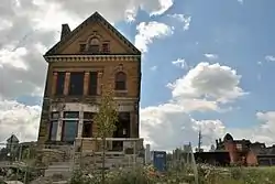 Originally part of a French ribbon farm, Brush Park was developed beginning in the 1850s as an upscale residential neighborhood for Detroit's elite citizens by entrepreneur Edmund Askin Brush. Dozens of Victorian mansions were built there during the final decades of the nineteenth century, and Brush Park was nicknamed "Little Paris" due to its elegant architecture.[8] The neighborhood's heyday didn't last long, however: by the early twentieth century most of is affluent residents started moving to more modern, quieter districts, and Brush Park was quickly populated by members of Detroit's fast-growing working class. Severely affected by depopulation, blight and crime during the 1970s and 1980s, the neighborhood is currently experiencing restorations of its historic buildings and luring new residents.[9][10]