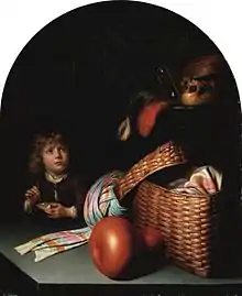 The painting portrays a young golden-haired boy looking up at a bubble, symbolising the beauty and fragility of life. On one side of him is a young plant growing in a pot, emblematic of life, and on the other is a fallen broken pot, emblematic of death. He is spot-lit against a gloomy background.
