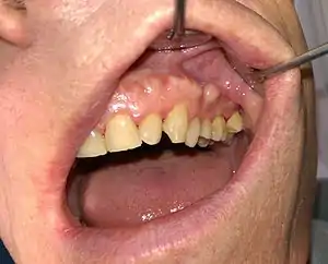 A buccal exostosis is an exostosis (bone prominence) on the buccal surface (cheek side) of the alveolar ridge of the maxilla or mandible. More commonly seen in the maxilla than the mandible, buccal exostoses are considered to be site specific.[2] Existing as asymptomatic bony nodules,[3] buccal exostoses don’t usually present until adult life,[4] and some consider buccal exostoses to be a variation of normal anatomy rather than disease. Bone is thought to become hyperplastic, consisting of mature cortical and trabecular bone with a smooth outer surface.[3] They are less common when compared with mandibular tori.[3]