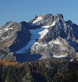 During the Pleistocene period dating back over two million years ago, glaciation advancing and retreating repeatedly scoured the landscape leaving deposits of rock debris.[5] The "U"-shaped cross section of the river valleys are a result of recent glaciation. Several glaciers lie on the slopes of Buck Mountain. Uplift and faulting in combination with glaciation have been the dominant processes which have created the tall peaks and deep valleys of the North Cascades area.