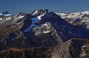 Buck Mountain is an 8,528-foot (2,599-metre) mountain summit located in the Glacier Peak Wilderness of the North Cascades in Washington state.[4] The mountain is situated in Chelan County, in the Wenatchee National Forest. Its nearest higher peak is Clark Mountain, 3.98 mi (6.41 km) to the southwest, and Brahma Peak is set 1.8 mi (2.9 km) to the south. Precipitation runoff from it drains into Buck Creek, Chiwawa River, and Napeequa River, each a tributary of the Wenatchee River. The mountain's name was applied by Albert Hale Sylvester (1871-1944), a pioneer surveyor, explorer, topographer, and forest supervisor in the Cascades.