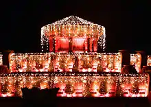 Buckingham Fountain is a Chicago Landmark in the center of Grant Park, and between Queen's Landing and Congress Parkway. Dedicated in 1927, it is one of the largest fountains in the world. Built in a rococo wedding cake style and inspired by the Latona Fountain at the Palace of Versailles, it is designed to allegorically represent nearby Lake Michigan. It operates from May to mid-October, with regular water shows and evening color-light shows. During the winter, the fountain is decorated with festival lights.