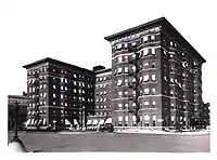 It was common for guests to live permanently at the hotel,[13][14] including the hotel's president, Walter James Holbrook.[15] Capitalist Ellis Wainwright died in the hotel in 1924, after living there as a recluse.[16] After 1920, the hotel faced stiff competition from the Chase Hotel, just a block north, and declined in significance. In December 1927, a fire in the hotel's annex led to the death of seven people.[17] The Buckingham Realty Company, which operated the hotel, fell into bankruptcy in 1928, and it sealed the fate of the Buckingham Hotel;[1][18] the intermingled accounts of the Buckingham Hotel Property and the Buckingham Annex constituted part of the problem.[19]