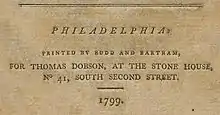 Henry Budd and Archibald Bartram (22 Mar 1774 - 1808),known as "Budd and Bartram" or "Budd & Bartram", started their printing partnership as early as 1794 to 1803. They printed much work for Thomas Dobson, At The Stone House, No.41, South Second Street. Budd and Bartram printers were located at 58 N. Second St. Philadelphia, Pa.