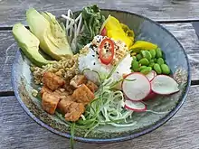 A Buddha bowl is a vegetarian meal, served on a single bowl or high-rimmed plate, which consists of small portions of several foods, served cold.[1][2] These may include whole grains such as quinoa or brown rice, plant proteins such as chickpeas or tofu, and vegetables.[3][4] The portions are not mixed on the plate or in the bowl, but arranged in an "artful" way. The concept appeared in 2013 ( Juice for Life ( now Fresh), in Toronto, Ontario, was offering this on their menu, prior to 2013, and a recipe for a Buddha Bowl is in their cookbook dated to 2000, featuring recipes from the 1990s) and has grown popular since early 2017.[5] Buddha bowls have been compared to Nourish Bowls (a non-vegetarian version) and to Poké Bowls (a Hawaiian raw fish dish).[6][1]