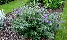 Buddleja 'Blue Chip' (Lo & Behold series), which Dennis Werner and Layne Snelling raised at the JC Raulston Arboretum at North Carolina State University (NCSU), is the world's first dwarf Buddleja. The cultivar is the result of the complex hybrid B. weyeriana 'Honeycomb' × (B. davidii Nanho Purple × B. lindleyana).[1][2] NCSU released the cultivar to commerce in 2007.[1] NCSU received United States plant patent number USPP19991P3 for 'Blue Chip' in 2009.[2] The public voted the plant to be the second most attractive cultivar of the 97 on display in the Buddleja cultivar Euro-trial that the Royal Horticultural Society conducted at RHS Garden Wisley in Surrey, England, during 2008.[3]