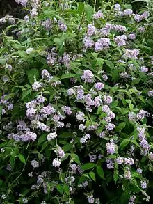 Buddleja delavayi is a Chinese species discovered by Forrest in the Tali Range above Dali (2000 – 2500 m elevation), Yunnan, in 1910;[1] it is also found in Xizang (Tibet).[2] The species was named for l'Abbé Delavay, the French missionary and plant collector, by Gagnepain in 1912.[2] The shrub is of interest to the botanist because of its unique (within the genus) resting buds and the different types of inflorescence produced through the year.[1]