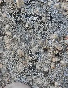 Buellia dispersa is a dull white to beige or dark brown crustose areolate lichen that grows on non-calcareous rock, such as basalt, granite and gneiss, in arid to semi-arid areas of northern Africa, Europe, and southwestern North America.[1][2] The areolas are distinct, becoming subsquamulose (lifting up at the edges) when separated and collecting in irregular patches, otherwise they form rosettes with lobed margins.[1] There is no prothallus.[1] It commonly occurs in the Mojave Desert, Channel Islands, and Santa Monica Mountains, also in the Cuyamaca Mountains, Santa Ana Mountains, and San Jacinto Mountains.[2] It is among the most common lichen species in the Sonoran Desert.