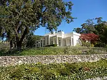 A reconstruction of Haraszthy Villa (also called the Palladian Villa[10]) is located on Castle Road near Buena Vista Winery. The building, a part of the Buena Vista Winery California Historical Landmark title as #892-1, is a reconstruction of the original villa built by Haraszthy in 1857. It looks over the original Haraszthy planted vineyards.[10] The property was the site of the first masquerade ball to celebrate the wine harvest in California. It was held October 23, 1864. Mariano Guadalupe Vallejo and Francisca Benicia Carrillo were the guests of honor at the ball.[11] The reconstructed villa was commissioned by Antonia Bartholomew in 1988.[10] It was completed in 1990. The architecture was based on photographs of the original building. As of its completion, it was owned and maintained by the Frank H. Bartholomew Trust. It was also maintained by Gundlach-Bundschu for a period of time. A museum was also located on site which examined the life of Bartholomew.[12]
