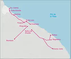 - Although Ensenada was the main terminus of the line, the BA&E later acquired several railway lines with their own terminus (such as Brandsen, Magdalena and Álvarez Jonte in Punta Indio Partido).