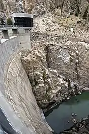 The dam is a concrete arch-gravity dam, 70 feet (21 m) wide at the base and 200 feet (61 m) wide at the crest, with an original height of 325 feet (99 m). The concrete structure measures 108 feet (33 m) deep at the base, tapering to 10 feet (3.0 m) at the crest, with a volume of 82,900 cubic yards (63,400 m3) of concrete.[7] It is anchored into Pre-Cambrian granitic rock on either side. The spillway is an uncontrolled overflow weir on the south side, 298 feet (91 m) wide, dropping through a tunnel in the left abutment.[4]
