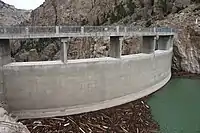Buffalo Bill Dam is a concrete arch-gravity dam on the Shoshone River in the U.S. state of Wyoming. It is named after the famous Wild West figure William "Buffalo Bill" Cody, who founded the nearby town of Cody and owned much of the land now covered by the reservoir formed by its construction. The dam is part of the Shoshone Project, successor to several visionary schemes promoted by Cody to irrigate the Bighorn Basin and turn it from a semi-arid sagebrush-covered plain to productive agricultural land.[3] Known at the time of its construction as Shoshone Dam, it was renamed in 1946 to honor Cody.[4]