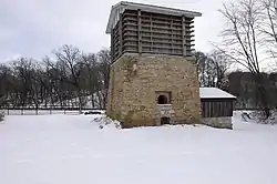 The lime house, attached to the kiln, was also fully restored. When the lime kiln was in use the small, attached room had served as a storage area but it had been gone since at least the 1930s.[3] Using early historical photographs as references, the lime house was reconstructed atop a stone foundation. The lumber used to construct the new lime house was authentic late 19th-century barn lumber.[3] Atop, the lime house, like the kiln itself, an aluminum roof was placed.