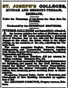 The Christian Brothers, a teaching order founded in Ireland by Edmund Ignatius Rice in the early 19th century, were invited to Queensland by Bishop of Brisbane James O'Quinn to assist in the development of Catholic secondary education in Queensland. The Order had established a permanent presence in Australia when Brothers Patrick Ambrose Treacy, John Barnabas Lynch and Dominic Fursey Bodkin immigrated to Melbourne in 1868. When Bishop O'Quinn's wrote of the urgent need for a teaching order of men in Queensland, Brother Patrick Ambrose Treacy, considered the founder of the Christian Brothers in Australia, responded by establishing a Christian Brothers school in Brisbane in 1875. The Brothers chose land on Gregory Terrace as the site for their school but while awaiting its construction, commenced teaching in 1875 at St Stephen's Catholic Church in Elizabeth Street. The school relocated to Gregory Terrace in 1880.[1]
