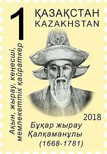 Bukhar-zhirau Kalkaman Uli (also: Bukhar-zhyrau Qalqamanuly, Kazakh: Бұқар жырау Қалқаманұлы; Russian: Буха́р жыра́у Калкама́нулы; 1668–1771) was a Kazakh poet at the court of the Middle Horde. His was active at the court during the reign of the Ablai Khan. Although his primary activity was law-making, poetry and singing, Kalkaman Uli also acted as an advisor to the Khan. Because of this, his poetry dealt with broader themes which included politics, the foreign policy of the horde, and the life of the Khan. Bukhar-jirau is not known to have written any epics.