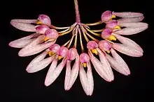 Bulbophyllum fenestratum is a species of orchid that is endemic to Southeast Asia. It is a small epiphyte with a single erect, egg-shaped leaf with the lower end towards the base, and seven to fifteen flowers about 10 mm (0.4 in) long on a peduncle 80–120 mm (3.1–4.7 in) long, each flower on a pedicel about the same length.[3][4]