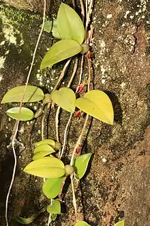 Bulbophyllum membranaceum is a species of orchid in the genus Bulbophyllum. It produces small maroon coloured flowers about six mm long. The pseudobulbs are rounded and each carries a single leaf. It is native to Papua New Guinea, Fiji, Samoa, Borneo, Sumatra, and other countries in the South East Asia region.