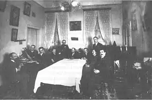 ![]() The leaders of the coup in the house of Ivan Rusev (the image has been restored). From left to right: Dimo Kazasov, Kimon Georgiev, Nikola Rachev, Yanaki Mollov, Ivan Valkov, Aleksandar Tsankov, Khristo Kalfov, Ivan Rusev, Petar Todorov, Tsvetko Boboshevski. | |||||||