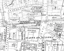 The inn was an important arrival and departure point for coaches from all over England but particularly from the north and Scotland.[5] It was in close proximity to the General Post Office at St Martin's Le Grand, built 1829, which was the start of the mail coach route north along the Great North Road past the inn and along Aldersgate Street. In 1830, it was acquired by the coaching entrepreneur Edward Sherman and rebuilt as the Queen's Hotel[3] at a cost of £60,000.[6] The architect was James Savage.[4][7] The hotel provided accommodation for passengers and underground stabling for 700 horses.[8] Walter Thornbury described it in 1878 as "much affected by Manchester men".[3]